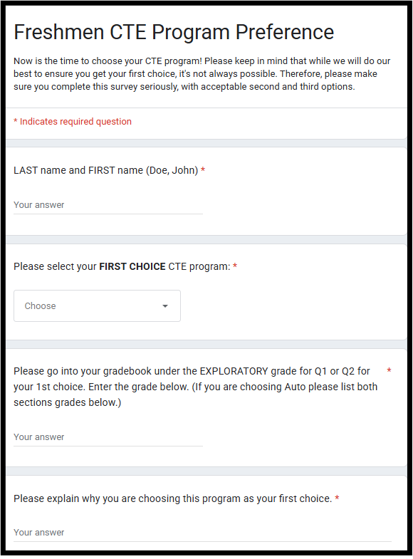 9th Grade - CTE Program Preference Survey on 1/15/26