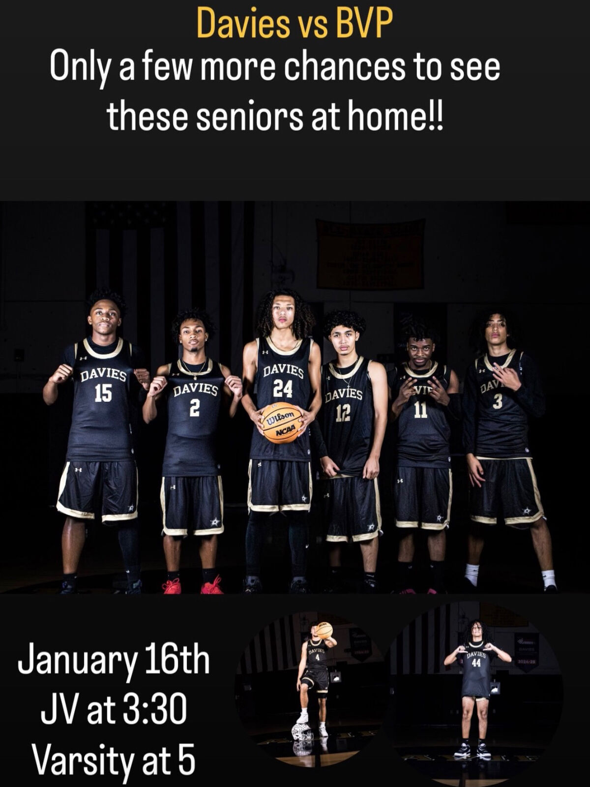 Davies VS BVPOnly a few more chances to see these seniors at home!January 16thJV at 3:30pmVarsity at 5pm